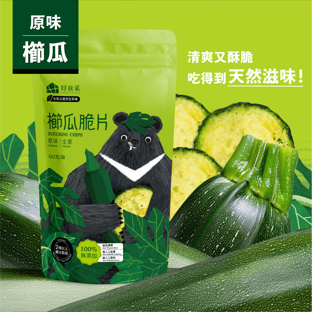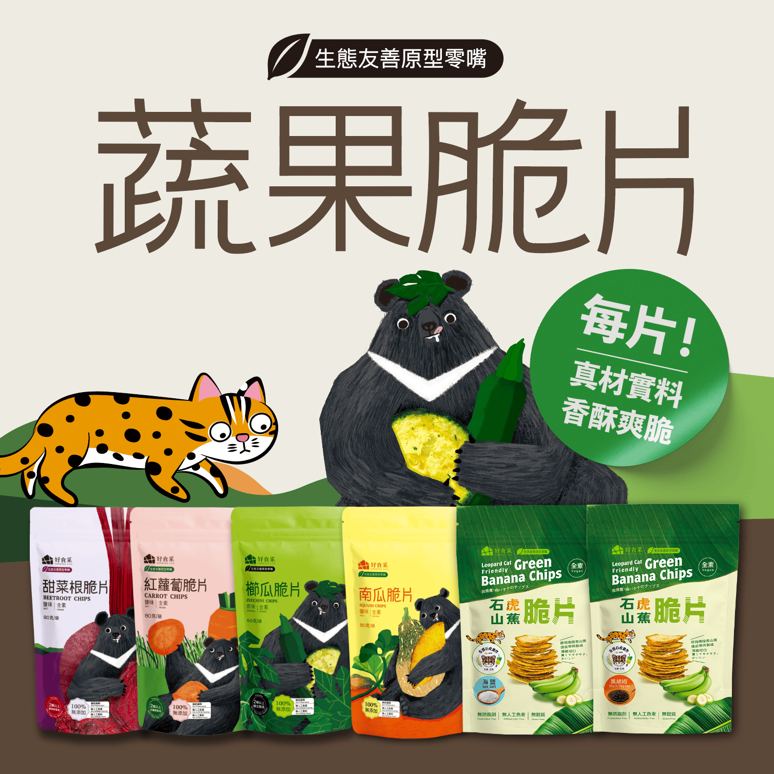 • 精選脆片口味:櫛瓜脆片/紅蘿蔔脆片/甜菜根脆片/南瓜脆片/石虎山蕉脆片