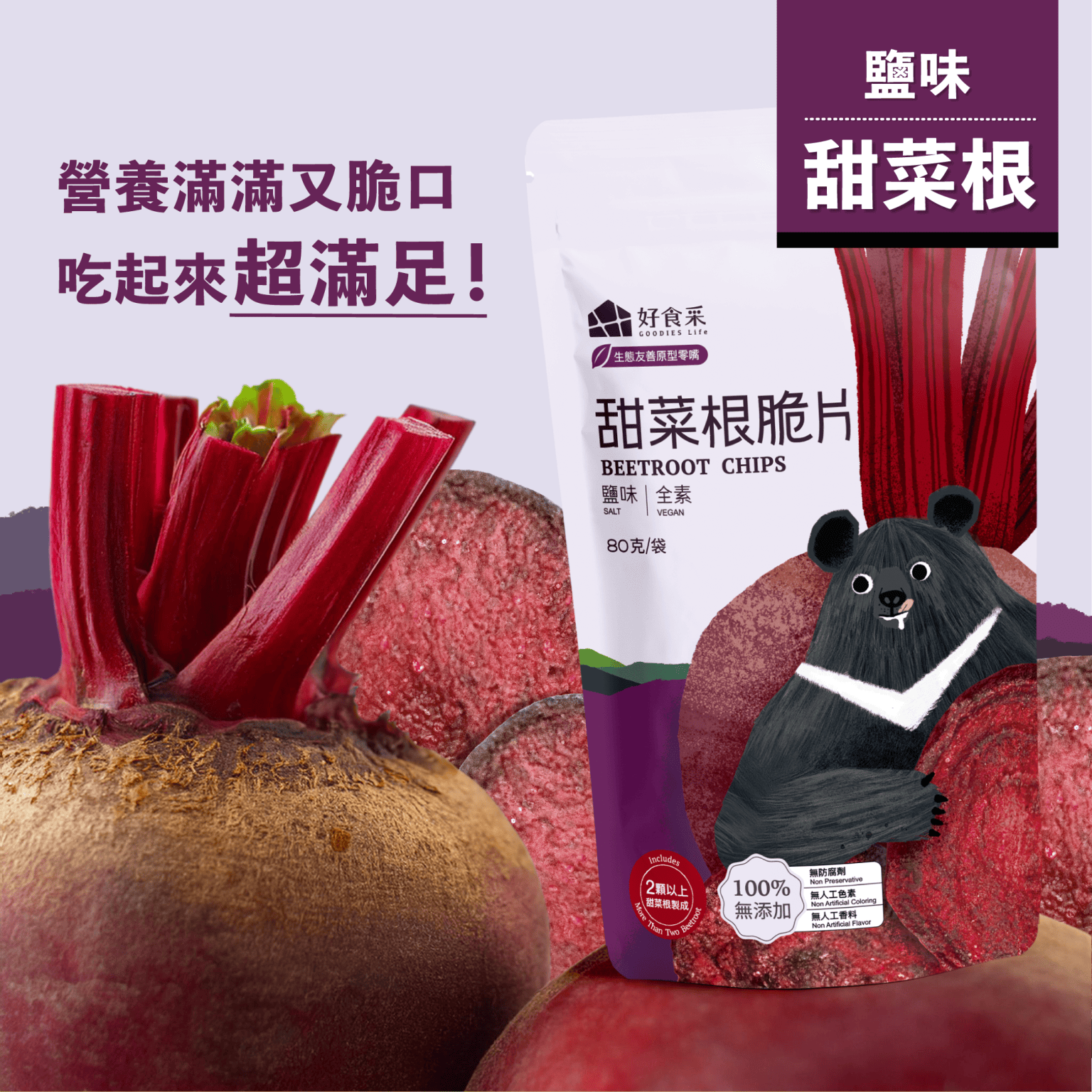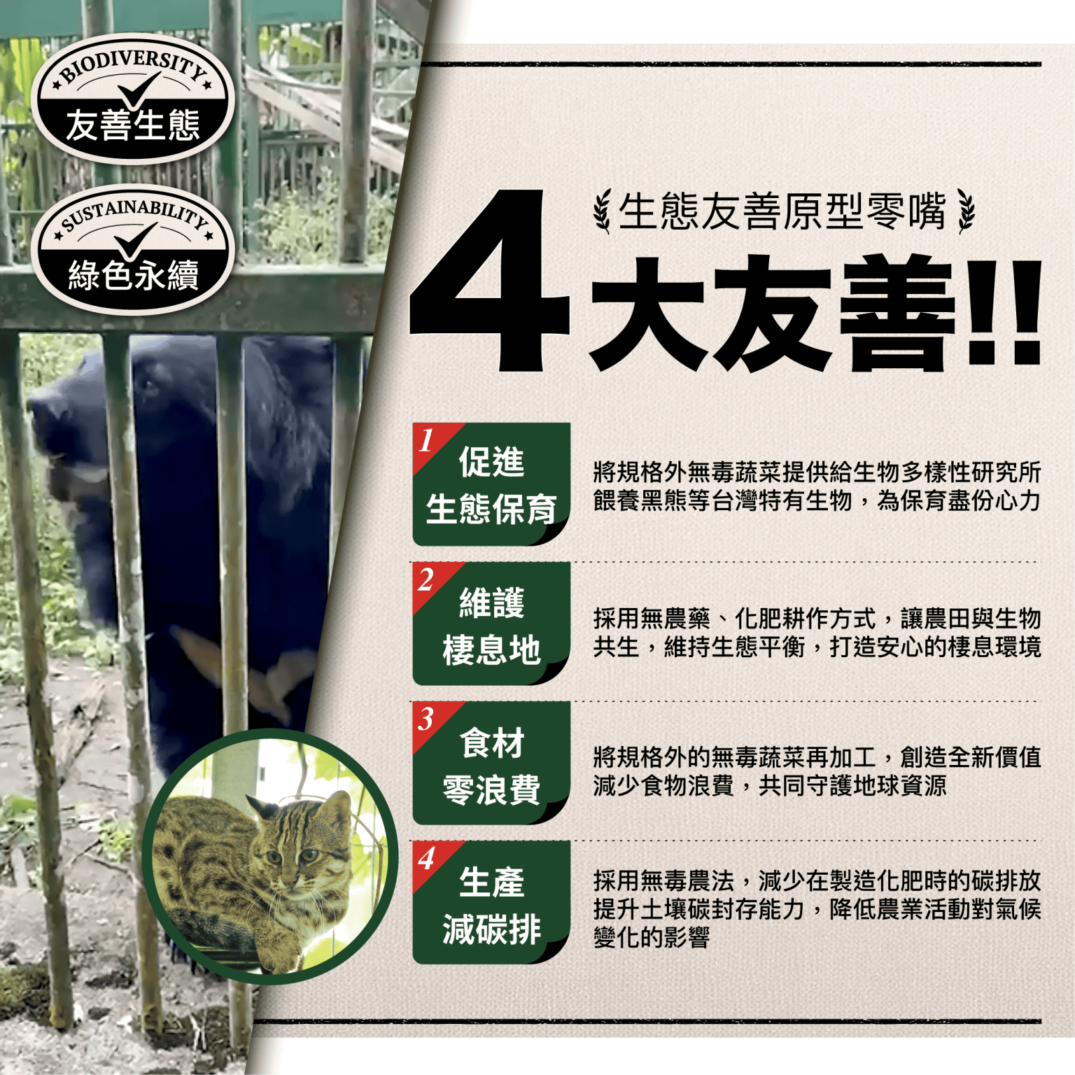 更重要的是,這款脆片背後隱藏著一份對生態的溫柔承諾。我們的櫛瓜、紅蘿蔔與甜菜根來自友善耕作的農地,不僅維護了動物的棲息地,也促進了生態多樣性。除此之外,我們也會提供蔬菜給生物多樣性研究所,餵養台灣黑熊等特有生物,協助生態保育。