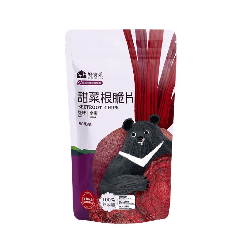 嚴選新鮮甜菜根,每包由兩顆以上完整甜菜根製成,讓您每口都能享受清脆與天然清甜。我們的甜菜根使用無毒農法栽種,不僅安心美味,更致力於食材零浪費,透過與生物多樣性研究所合作,將規格外的甜菜根餵養台灣黑熊,支持生態保育。